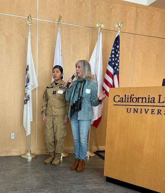 Linda speaking at a Delta Kappa Gamma area conference for educators, We Rise Together, with a former student of the Life Lessons Program.